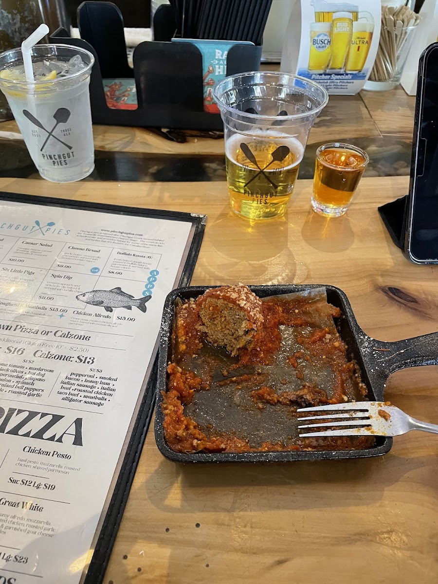 ground beef & pork, Italian spices, homemade from scratch, topped with marinara sauce and parmesan cheese